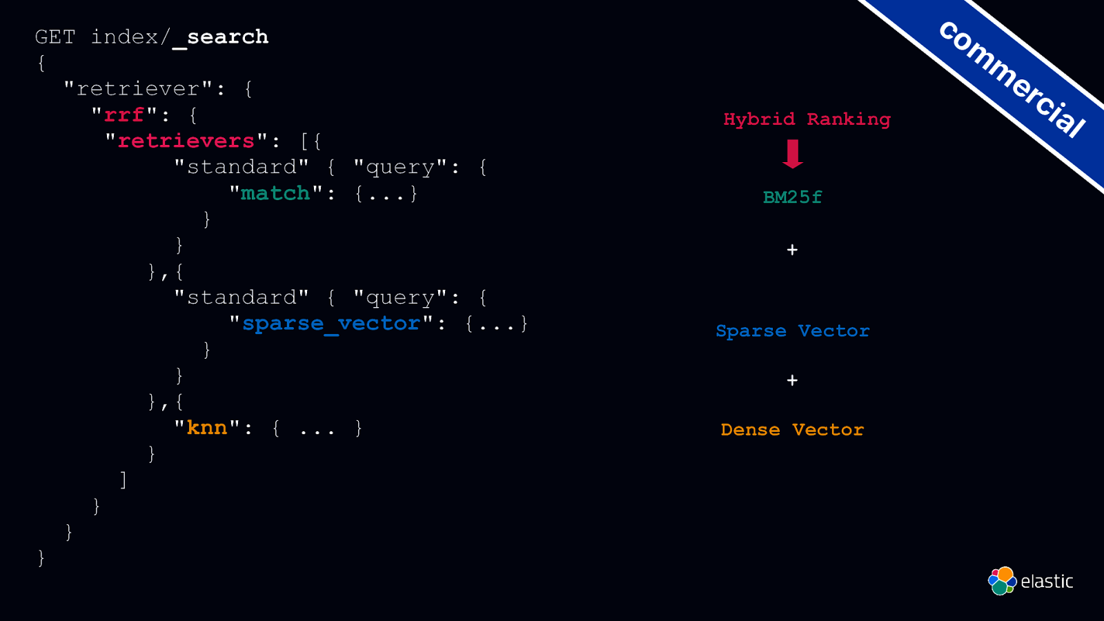 GET index/_search { “retriever”: { “rrf”: { “retrievers”: [{ “standard” { “query”: { “match”: {…} } } },{ “standard” { “query”: { “sparse_vector”: {…} } } },{ “knn”: { … } } ] } } } Hybrid Ranking BM25f + Sparse Vector + Dense Vector co m m er ci al